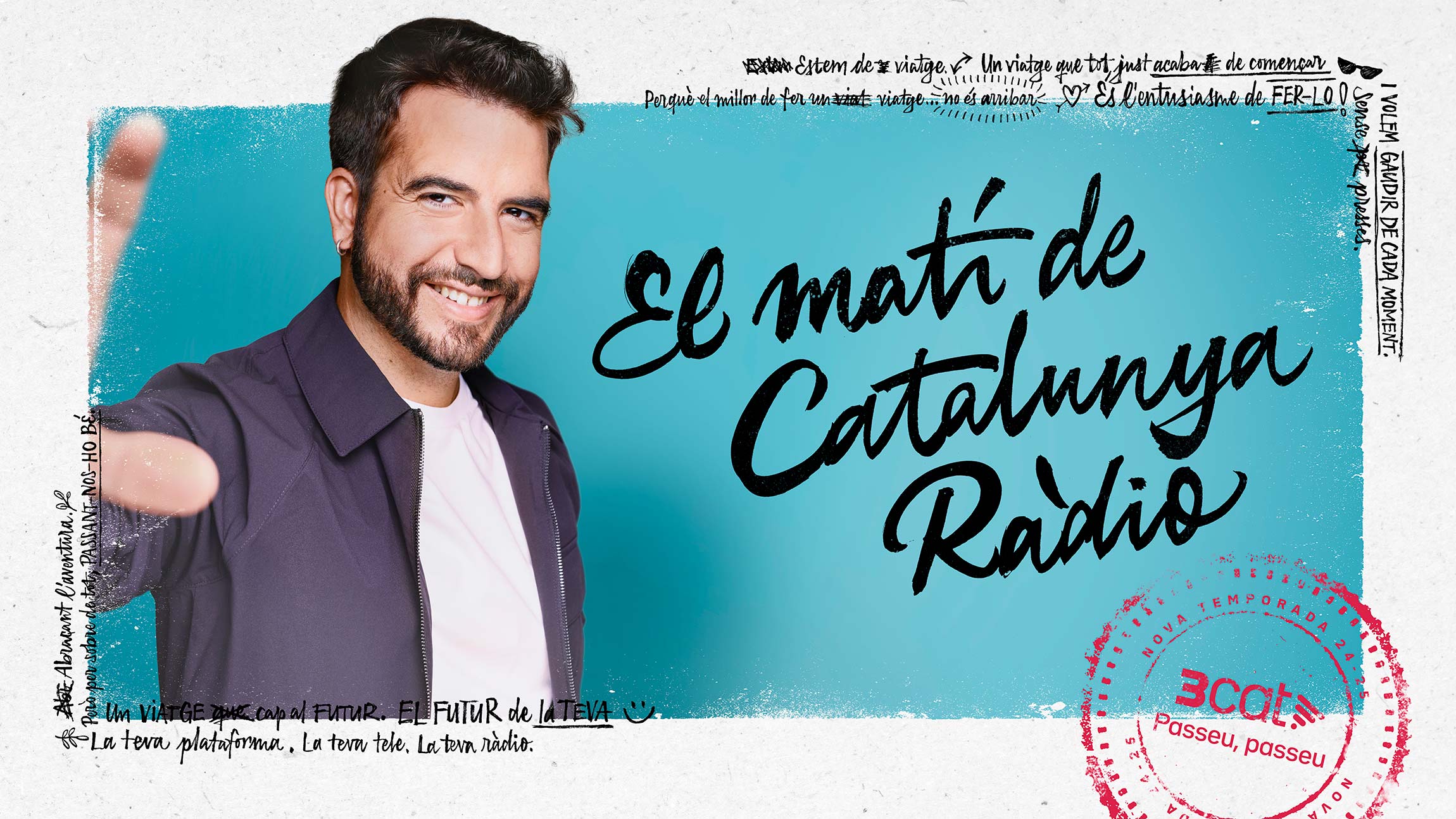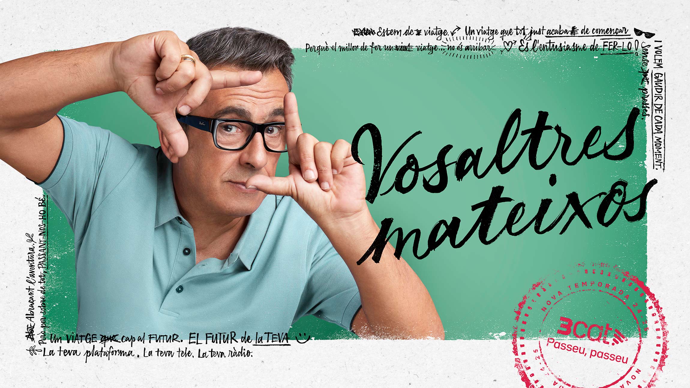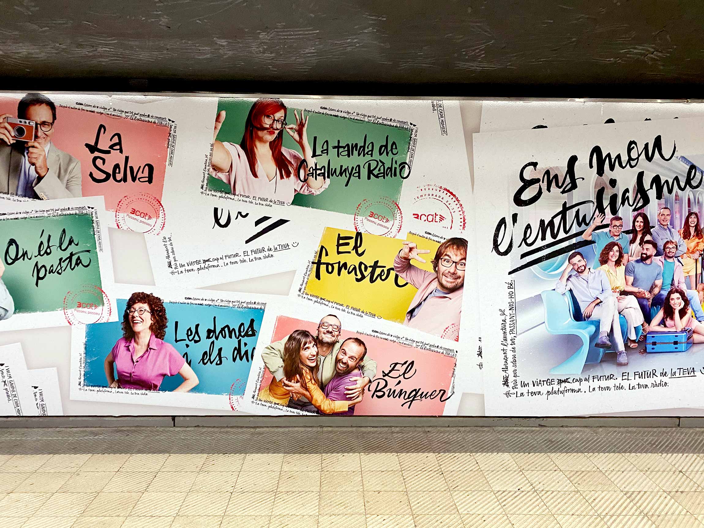 The advertising and digital marketing campaign for the new 3Cat 2024-2025 season was built around the slogan “Ens mou l’entusiasme” (We are driven by enthusiasm). Each year, Catalonia's public media corporation presents its new releases, highlighting its most relevant programs. For this campaign, the TV spot was centered on the idea of travel, connecting all campaign visuals to the aesthetics of travel notebooks and spontaneous photos.