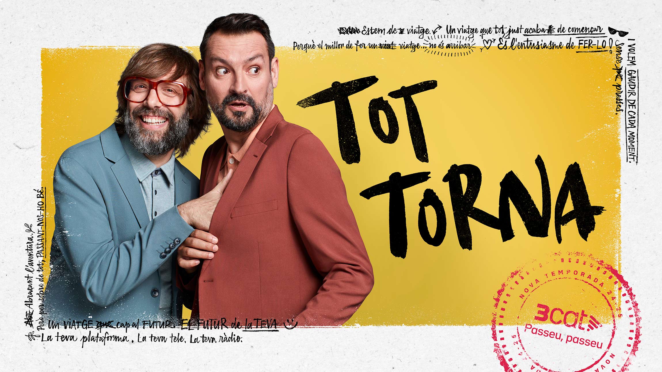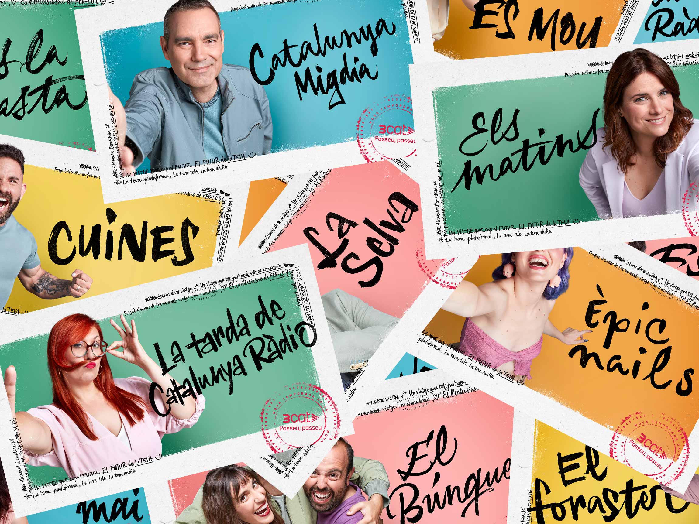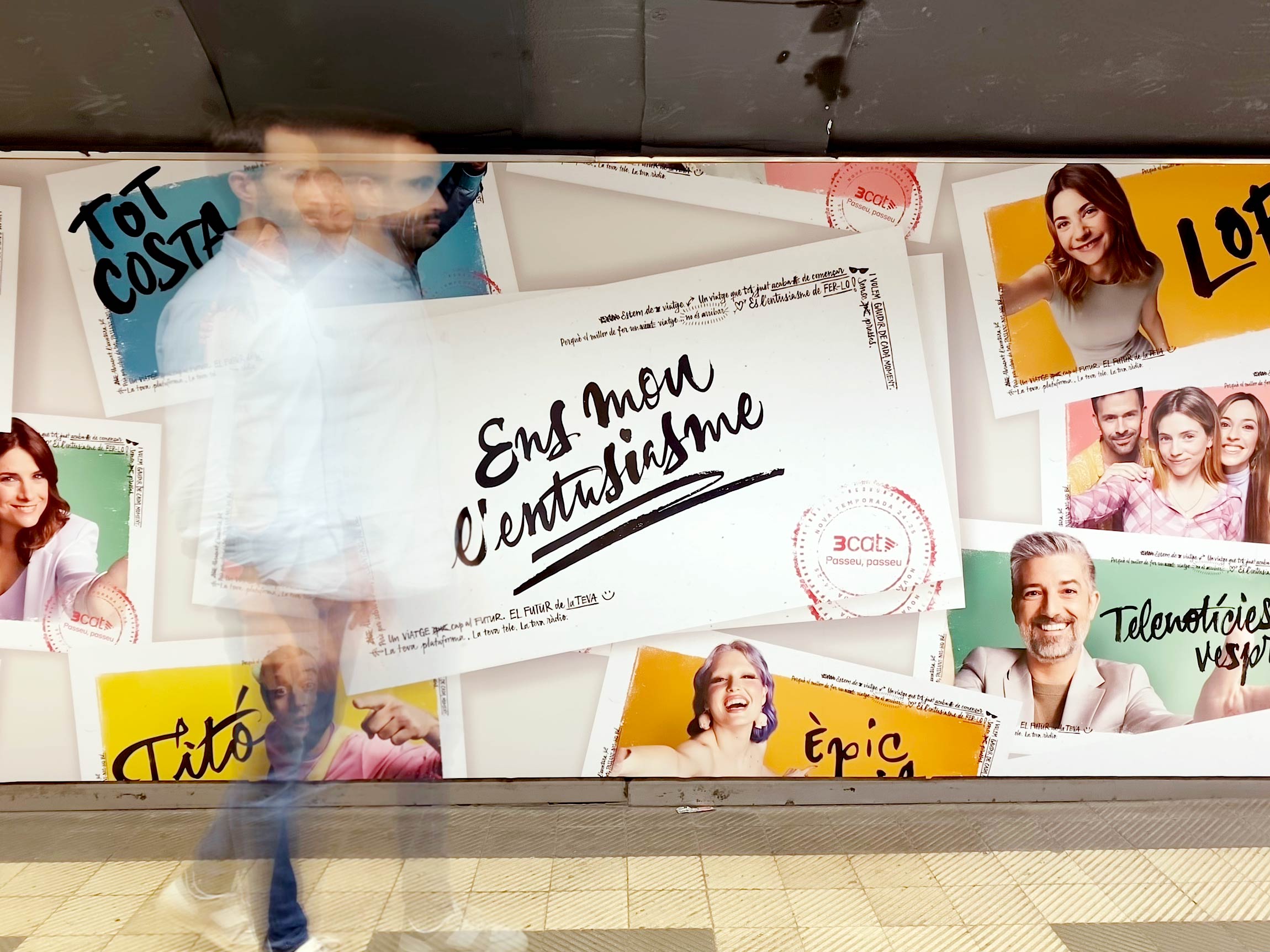 The advertising and digital marketing campaign for the new 3Cat 2024-2025 season was built around the slogan “Ens mou l’entusiasme” (We are driven by enthusiasm). Each year, Catalonia's public media corporation presents its new releases, highlighting its most relevant programs. For this campaign, the TV spot was centered on the idea of travel, connecting all campaign visuals to the aesthetics of travel notebooks and spontaneous photos.